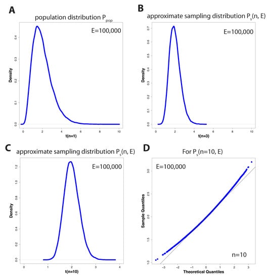 In Figure (A–C) we show approximate sampling distributions for different values of the sample size n. Figure (A) shows = 100,000) which is equal to the population distribution of . Figure (D) shows a qq-plot comparing = 100,000) with a normal distribution.