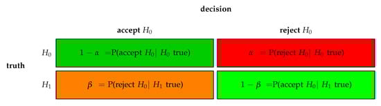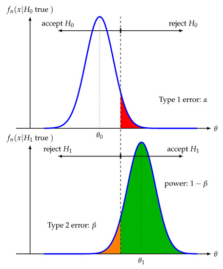 Briefly, Fisher introduced the concept of a p-values while Neyman and Pearson introduced the alternative hypothesis as complement to the null hypothesis, type I and type II errors and the power. There is an ongoing discussion about the differences of both concepts see, for example, References [37,38,39], which is in general very difficult to follow because these involve also philosophical interpretations of those theories. Unfortunately, these differences are not only of interest for historical reasons but lead to contaminations and misunderstandings of the modern formulation of statistical hypothesis testing because often arguments are taken out of context and properties differ among the different theories [40,41]. For this reason, we discuss some of those in the following.