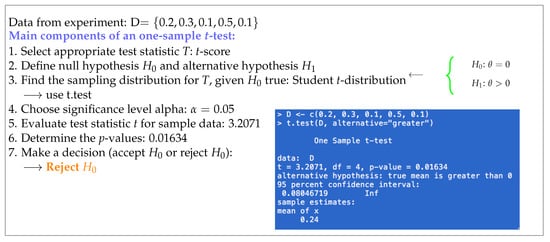 On the left-hand side of Figure 7 a summary of the test is presented and on the right-hand side of Figure 7 we show a script in the programming language R providing the numerical solution to the problem. R is a widespreadly used programming language to study statistical problems [34]. The solution script is only two lines, in the first the data sample is defined and in the second the hypothesis test is conducted. The command ‘t.test’ has arguments that specify the used data and the type of the alternative hypothesis. In our case we are using a right-sided alternative indicated by ‘greater’. In addition, the null hypothesis needs to be specified. In our case we used the default which is , however, by using the argument ‘mu’ one can set different values.