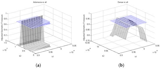Parameter choice 1. The x and y axes represent the values of the parameters of the two methods, while on the z axis is plotted the AGF for two of the OvA configurations of the dataset in [24]: (a) Artemisia vs. all and (b) Danae vs. all. The gray and blue surfaces represent, respectively, the results with the AKS and SVM classifiers.