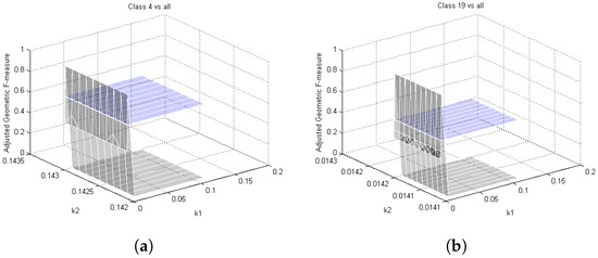 Parameter choice 2. The x and y axes represent the values of the parameters of the two methods, while on the z axis is plotted the AGF for two of the OvA configurations on the dataset in [5]: (a) Class 4 vs. all and (b) class 19 vs. all. The gray and blue surfaces represent, respectively, the results with the AKS and SVM classifiers.
