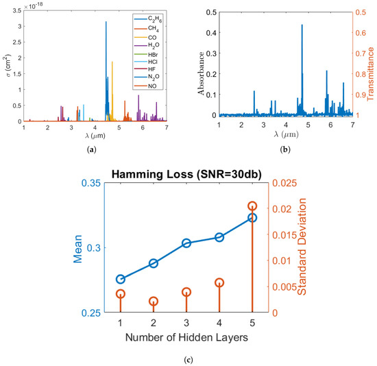 (a) Absorption cross-section of each gas molecule as a function of wavelength (); (b) the absorption/transmission spectrum of a sample gas mixture at SNR = 30 dB and (c) Hamming loss vs. the number of hidden layers when the SNR is and gas labels are independent.