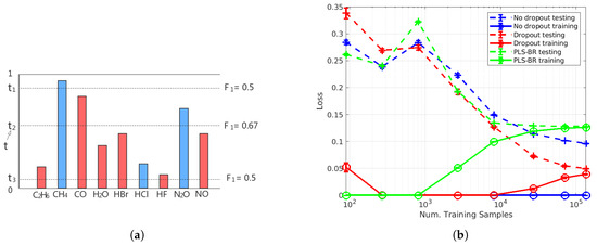 For binary classification problems in single-label learning, the sigmoid activation function of the output layer results in output scores that are between 0 and 1, and those output scores are often interpreted as the probabilities of the two possible classes. For each sample in the testing set, its predicted class will be the one with more than 0.5 probability (output score), so the classifier can be viewed as an FNN model with a threshold . As shown in our Results Section, mislabelling of an extremely low concentration of a specific gas species as absent from the sample occurs more frequently than mislabelling a non-existing gas species as existing in the sample. This results in an imbalance between recall and precision. To re-balance recall and precision for higher , adopting an optimal threshold t for each label in each instance is desirable. For samples in the training set, the method of determining t is illustrated in Figure 4a. Suppose we have obtained output scores for all nine labels of a gas mixture. Three of them (blue ones) have the ground truth value of 1 (gas species exists in the sample), and the rest of the labels in red are 0 (gas species is absent in the sample). Then, we calculate the scores for the three candidates and of t (dash lines), and the candidate with the highest score, which is in this example, is the t we need. In our model, we use output scores to calculate the candidates of t. For each sample, nine output scores will be formed into an increasing order: . Since the sigmoid function is used in the output layer, all output scores are between 0 and 1. Therefore, the ten threshold candidates will be: