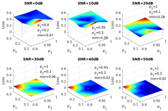 In order to tune the hyper-parameters for dropout, a grid search was conducted on retention probabilities of the input and hidden layers. A typical choice of retention rate is 0.8 for the input layer and 0.5 for the hidden layer [34], and a preliminary search on our datasets showed that the optimal choice of was around (0.95, 0.2). More detailed tests on and were done around this point, and the results of all SNRs are shown in Figure 5. Combinations of and with the lowest Hamming loss will be applied to our model.