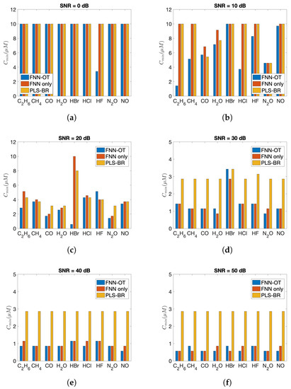 Minimum detectable concentration () of nine gases at (a) SNR = 0 dB, (b) SNR = 10 dB, (c) SNR = 20 dB, (d) SNR = 30 dB, (e) SNR = 40 dB and (f) SNR = 50 dB.
