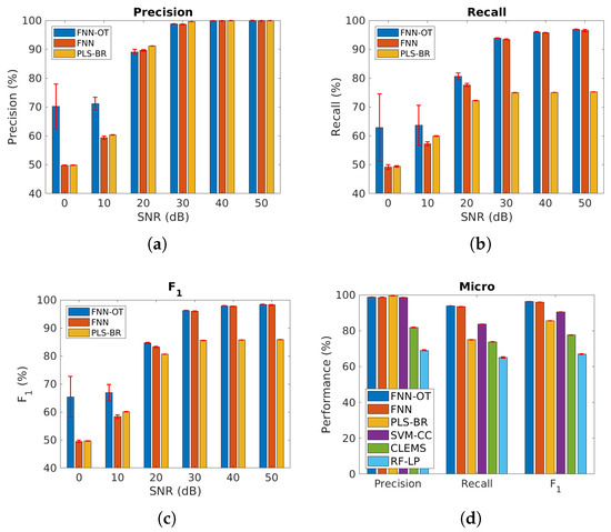 We further applied our models to the cases when the gases were correlated. As shown in Figure 8a–c and Table 2, when SNR was above , the performance of the three models was similar to the uncorrelated case, and FNN-OT outperformed. Further, at SNR = or , FNN-OT significantly outperformed the other two models and its own results of the uncorrelated case due to the fact that FNN-OT could collaboratively identify gas species by organizing their correlation, while FNN and PLS-BR were not capable of this. Since PLS-BR ignored label correlations completely, in Figure 8d and Table 3, three models, support vector machine-classifier chains (SVM-CC), cost-sensitive label embedding with multidimensional scaling (CLEMS) and random forest-label powerset (RF-LP), were added as additional base models for comparison. SVM-CC is the combination of a common classifier support vector machine (SVM) and a problem transformation method classifier chains (CC), where CC exploits label correlation information with a chain of classifiers. CLEMS is a well performing label embedding method that transforms original labels into new embedded space. Along with CLEMS, we applied the random forest regressor and the multi-label k-nearest neighbor (MLKNN) classifier, which is a common combination used for label embedding. RF-LP uses the label powerset to map the combinations of original labels into new single labels for random forest to classify. The results in Figure 8d show that SVM-CC, CLEMS and RF-LP had lower micro-averaged precision, recall and score compared to FNN-OT.