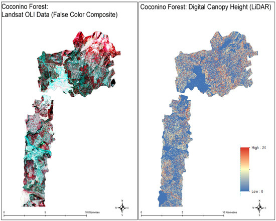 This study is conducted in the area on the west and north west of Flagstaff, Arizona. This region falls in the area of Coconino National Forest Flagstaff, Arizona. Coconino national forest spans a total area of 1.85 million acres. The average annual temperature of the forest is 8 C. Average annual rainfall precipitation is mm and average snowfall is cm. This forest is home to various tree species, especially Ponderosa pines, Limber pine, Single leaf pinyon pine, Arizona cypress and many others [39]. The type of vegetation in this forest is dependent upon the elevation. At lowest elevations (4500 feet to 6500 feet), the forest is mainly covered in sagebrushes and small shrubs. In elevations between 6500 feet and 8000 feet, the majority of the area is covered by Ponderosa pine (average height of 37 m) [40]. Our area of study falls in this elevation bracket. Other species situated in the region of study are Rocky Mountain juniper (average height of 15 m), quaking aspen (average height of 23 m) and Gambel oak (average height of 6 m). Table 1 shows the percentage coverage of the type of trees in the study area. The maps shown in the Figure 1 display the area under study. The left image shows the false color composite of Landsat data and the right image shows the corresponding canopy height model.