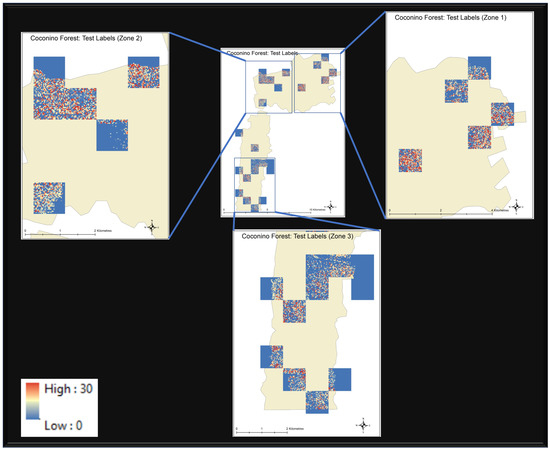 The input Landsat and the target canopy height images are divided into 30 × 30 pixel image tiles with no overlap. The dataset forms a total of 87 (30 × 30) images. Both input and target images are normalized using min-max scaler and then partitioned into training and test set by the 70:30 ratio. The training dataset is further partitioned into training and validation set by ratio of 85:15. The training data is used to train the model and is validated via validation dataset on each training epoch. The test dataset is then used to model the generalization error. Figure 2 displays the true CHM of test data set and shows that the test dataset is evenly distributed over the whole study region.
