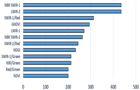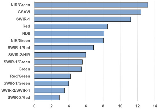 In the third approach, individual features (selected bands, band ratios and vegetation indices) are assessed one-by-one using CNN training and are ranked based on validation mean square error. Figure 4 displays the features with their usefulness. Once the features are enlisted based on their usefulness, a threshold is defined on feature score to remove the “less useful” features. Features in Figure 3 do not match with features in Figure 4 or have different ranking placement. There are three major factors that may cause this difference. First, geographical locations of areas under study are very different. Second, types of vegetation under study are different and third, the mechanism to select features in the two studies is very different.