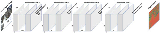 For this research work, we experimented with multiple configurations of the CNNs and after comprehensive testing process we proposed the network architecture shown in Figure 5. The network takes image as input where N is the total number of bands. There are four convolutional layers in the network. The first layer extracts 256 features from the input data at full resolution. The result of the first layer is fed to the second convolutional layer which extracts 8 features from its input image. The third layer extracts 16 features whereas the fourth (and the last layer) extracts one feature image which is then passed through linear activation function. We have bypassed the fully connected layer and the result of the linear activation layer is considered the target image. We use drop out of at first layer to avoid the overfitting problem. Each layer is followed by batch normalization and activation function of rectified linear unit (ReLu) except the final layer (for which the activation is linear). The stochastic gradient descent function is used for training with the Mean Absolute Error (MAE) as loss function as shown in (1). We utilize the MAE as loss metric to be able to make a fair comparison with [34].