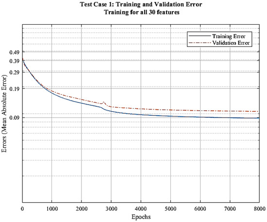 In the last case, we determine the features’ usefulness score for our proposed CNN model. Figure 4 shows the usefulness score of the feature in descending order. We select all the features with score greater than or equal to 200 and use them in the training process of the final CNN model. Figure 8 displays the training and validation error vs. epoch curves. The training and validation error decreases down to 0.085 (2.89 m) and 0.0904 (3.092 m).