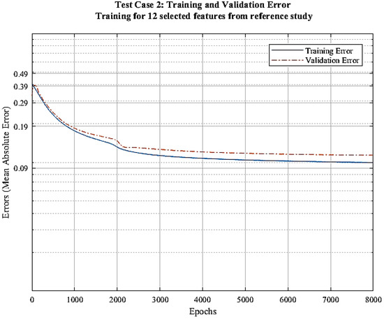 In this approach, we select features in order to avoid overfitting. We select features according to criteria mentioned in [34]. There seems to be no improvements in the training process when the features selected from the research in [34] are utilized. The consistent gap in the training and validation errors clearly indicates that the model is still overfitting. This is probably due to the fact that these features are scored based on their performance on random forest regression algorithm and are not suited to be used for CNN. Figure 7 displays the training and validation error of the process vs. epochs.
