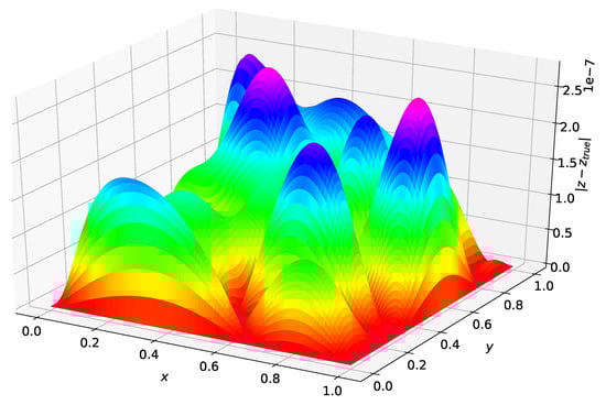 The previous example derived the constrained expression by creating and solving a series of simultaneous algebraic equations. This technique works well for constrained expressions in one dimension; however, it can become needlessly complicated when deriving these expression in n dimensions for constraints on the value and arbitrary order derivative of dimensional manifolds []. Fortunately, a different, more mechanized formalism exists that is useful for this case. The constrained expression presented earlier consists of two parts; the first part is a function that satisfies the boundary constraints, and the second part projects the free-function, , onto the hyper-surface of functions that are equal to zero at the boundaries. Rearranging Equation (2) highlights these two parts,