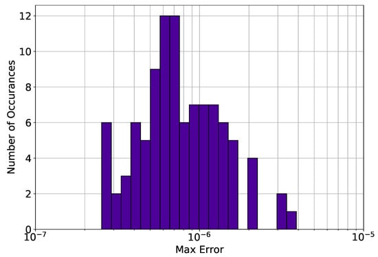 Figure 1 shows the difference between the analytical solution and the estimated solution using Deep TFC on a grid of 10,000 evenly distributed points. This grid represents the test set. Figure 2 shows a histogram of the maximum solution error on the test set for 100 Monte Carlo trials.