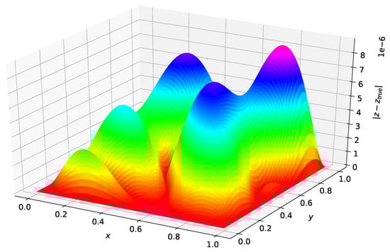The neural network used to estimate the solution to this PDE was a fully connected neural network with 6 hidden layers, 15 neurons per layer, and 1 linear output layer. The non-linear activation function used in the hidden layers was the hyperbolic tangent. Other fully connected neural networks with various sizes and non-linear activation functions were tested, but this combination of size and activation function performed the best in terms of solution error. The biases of the neural network were all initialized as zero, and the weights were initialized using TensorFlow’s™ implementation of the Xavier initialization with uniform random initialization []. One hundred training points, , evenly distributed throughout the domain were used to train the neural network.