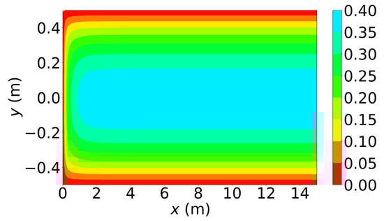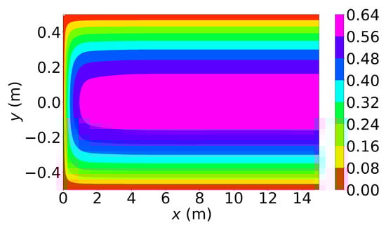 Figure 6, Figure 7 and Figure 8 show the u-velocity of the fluid throughout the domain at three different times. Qualitatively, the solution should look as follows. The solution should be symmetric about the line , and the solution should develop spatially and temporally such that after a sufficient amount of time has passed and sufficiently far from the inlet, , the u-velocity will be equal, or very nearly equal, to the steady state u-velocity of problem 3. Qualitatively, the u-velocity field looks correct in Figure 7 and Figure 8, and throughout most of the spatial domain in Figure 6. However, near the left end of Figure 6, the shape of the highest velocity contour does not match that of the other figures. This stems from the fact that none of the training points fell near this location. Other numerical estimations of this PDE were made with the exact same method, but with different sets of random training points, and in those that had training points near this location, the u-velocity matched the qualitative expectation. However, none of those estimated solutions had a quantitative u-velocity with an error as low as the one shown in Figure 6, Figure 7 and Figure 8. Quantitatively, the u-velocity at from Figure 8 was compared with the known steady state u-velocity, and had a maximum error of m per second and an average error of m per second.