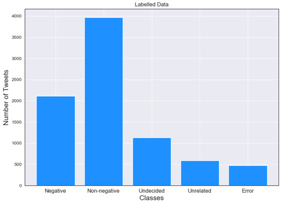 Lexical characteristics can be thought of as certain unique features in text-based data, which can be used to distinguish each class of the set i.e., Negative Tweets from Non-Negative. Drawing information from previous literature [,,], we evaluated several lexical characteristics of the same previously labeled dataset. One of our motivations was to discover whether a combination of USA, UK, and Canadian English language, which differs considerably, can have predictable lexical characteristics in Negative and Non-Negative class. This covered a wide range of tests, which are described below. Before running the tests, the data was pre-processed as described previously, where user mentions were not removed, and hashtags were not stripped of the hash character, as this was used to locate them in the dataset. Additionally, words were not lemmatized, in order to retain all different variations and the dataset was not balanced to include all labeled Tweets from both classes. Apart from the aforementioned changes, data preparation was the same.