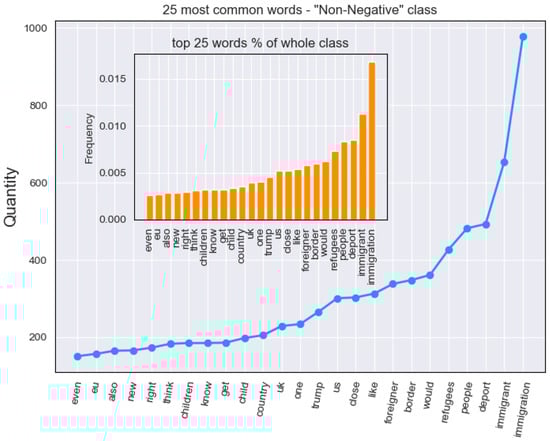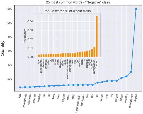 We explored the top 10 hashtags for both classes. Table 2 depicts our findings and Figure A1a illustrates the volume for the Negative class, indicating that there were four most omnipresent hashtags, namely: #illegalaliens with 115 occurrences, followed by #deportthemall (88), #banislam (61) and #buildthewall (42). A similar pattern can be observed in the top 25 words for the same class. Very few terms constitute the most common, followed by a sudden drop and almost even distribution of other hashtags. On the contrary, the Non-Negative class again showed a slightly more even distribution, with hashtag #trump being the most common (145 occurrences) followed by #immigration, which appeared almost half as much as the top one (81), #liberals and #senate with occurrences of 49 and 44, respectively ( Table 2 and Figure A1a).