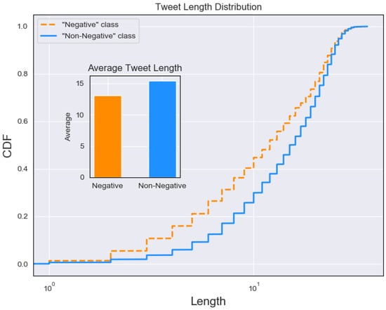 Another feature that we considered was the length of Tweets and words for each class. Although the total length of Tweets was taken under consideration in the past [], this could not be used in our work, because the analyzed dataset was imbalanced i.e., number of Tweets per class was different, which would result in biased values. Thus, the length of all Tweets/words for each class were used instead, in order to present differences/similarities between these features through Cumulative Distribution Function (CDF), which has been previously used to represent data in similar tasks [].