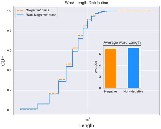 Figure 4 illustrates a CDF representing the results from our analysis, which measures the Tweet lengths in both classes. As the results suggest, a noticeable difference exists in Tweet lengths, as the majority of Negative Tweets are shorter than Non-Negative. 40% of the distribution represents the differences where Negative Tweets had length of 10 or less and Non-Negative 13 or less. Looking at 60% of the distribution Negative had length of 15 words or less and Non-Negative 18 words or less. The inner plot shows averages for Tweet lengths, where the difference can also be observed at approximately 2% between classes with 13% for Negative and just over 15% for the other. Figure 5 illustrates a CDF representing the results for word lengths. No significant differences in word lengths were found and only a very trivial variation can be observed both in terms of CDF and averages (inner plot).