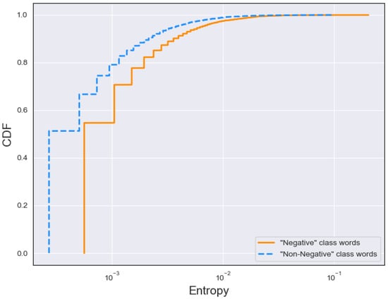 Next, we analyzed the entropy, which refers to a measure of information, sometimes referred to as a measure of uncertainty. Whhen considering word frequency in a text as an example, the highest uncertainty to whether a word will appear is when its frequency is 0.5, which means it has 50% chances of appearing. On the contrary, if the frequency of a word is high or low, there is less uncertainty to whether it will appear (low entropy). Low-frequency word is unlikely to occur; therefore, we are more certain that it will not show up, with the same applied to the high-frequency word, which is more likely to occur. Therefore, entropy is the highest for uniform distributions, e.g., in a text where each word has a similar probability (frequency). In our work the entropy of each word is calculated for both Tweet classes and, as previously, depicted as a CDF. Our objective was to determine which class has lower word entropy, therefore being less random, with our calculations being based on Shannon’s entropy formula.