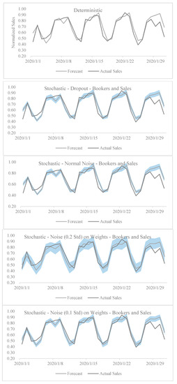 Actual vs. predicted sales forecast of (1) stochastic dropout models and (2) noise embedded in predicted pales and active booker count input variables. The y-axis represents the normalized sales, whereas the x-axis represents the dates of January 2020. The shaded area represents the range of stochastic variance (uncertainty) in the model predictions.