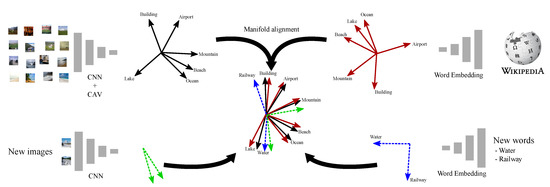 To explore new concepts related to landscape beauty using CAVs would require building a large image dataset based on a prohibitively large amount of manually chosen concepts. This is unpractical, since such database would be problem-dependent and costly to build. Instead, we propose to map vectors from word embeddings into the space of CAVs. The intuition is that word embeddings are defined with large dictionaries and span a wider set of concepts than any image-based dataset, but might still have a local structure comparable to the CAVs. Since word embeddings are of different nature and dimensionality than image-based representations, we need to align the two representations to each other in a new latent vector space. To do so, we use the semi-supervised manifold alignment method [12] (Code available at https://github.com/dtuia/KEMA [13]).