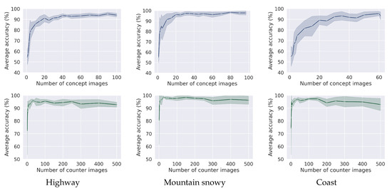 CAV average accuracy of concepts highway, mountain snowy and coast with a varying number of concept images (top row) and counter images (bottom row). The shadowed band indicates the standard deviation over the ten runs.