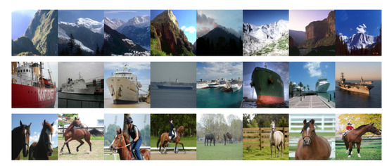 Eight nearest neighboring images in the test data to the determined Broden CAVs for concepts mountain, ship and horse.