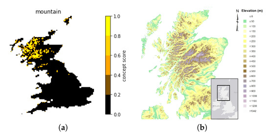 We used the location of the SoN images to validate the concept scores obtained with clearly identifiable physical features. We selected the concept mountain and mapped the score geographically in Great Britain, as depicted in Figure 7. The area highlighted in Figure 7a gives a clear indication in which region of the UK the SoN images contain mountains. This corresponds with the elevation map of the same region, shown in Figure 7b.