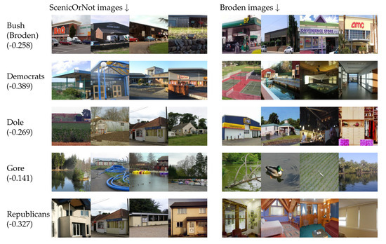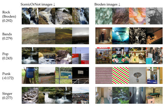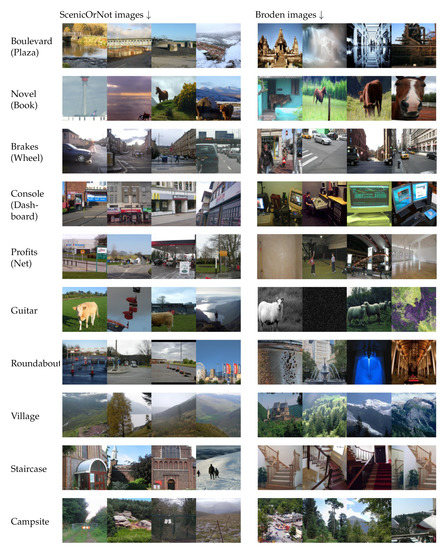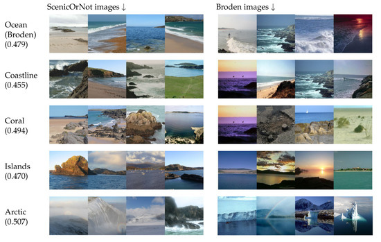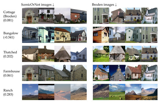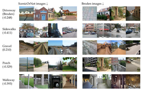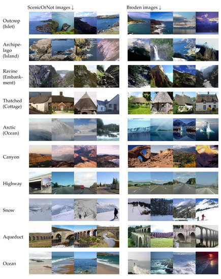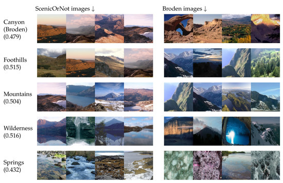 The concept score was linked with the scenicness score of the SoN images, using Kendall’s correlation coefficient. The coefficient indicates how each concept is correlated with the scenicness score, i.e., it provides an indication of concepts related to higher or lower scenicness. Table 1 presents the ten concepts showing the highest positive correlation with scenicness; these concepts relate to nature and outdoors concepts, in line with the observations of [2,3,4]. Similarly, Table 1 presents the ten concepts with strongest negative correlation, and indicates that man-made structures are mostly associated with unscenic landscapes.