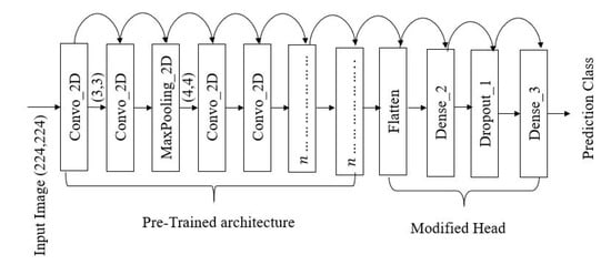 A transfer learning technique was implemented to develop the models [] by acquiring model’s weight from pre-trained models (i.e., ImageNet []). The primary model’s architecture contains three components—pre-trained network, modified head, and prediction class (inspired from []). The pre-trained networks are employed to extract the high-level features and connected to the modified network and classification head, respectively. Figure 1 illustrates one of the modified proposed models’ architecture. The architecture contains 16 [] CNN layers with different filter numbers, sizes, and stride values.