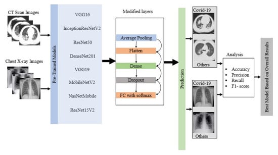 where True Positive ()= COVID-19 patient classified as patient, False Positive ()= Healthy people classified as patient, True Negative ()=Healthy people classified as healthy, and False Negative ()= COVID-19 patient classified as healthy. Figure 3 shows the overall flow diagram of the experiment. The best model was selected based on the statistical analysis on CT scan and chest X-ray image datasets.