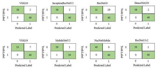 The confusion matrix was calculated on the test set to simplify the understanding of the model’s performance. Figure 4 displays the confusion matrix for different models on given CT scan images. In CT scan, the test set contained 80 patients, where 40 were COVID-19 and 40 were non-COVID-19. In this case, NasNetMobile demonstrated the best result by correctly classifying 72 samples, while ResNet50 showed the worst performance by classifying 44 samples out of 80.