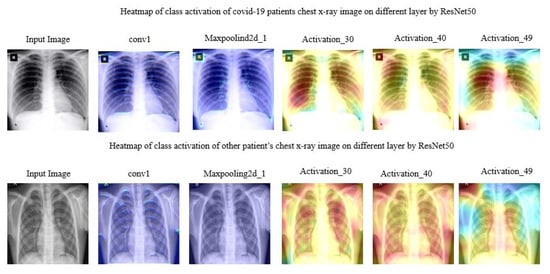 Figure 7 manifested the different layer’s activity of model ResNet50 on chest X-ray images. The region spotted by model ResNet50 was highlighted with a heatmap.