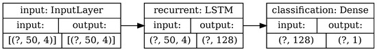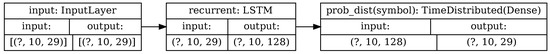 For that purpose, we trained an RNN until achieving 100% accuracy on the training data consisting of 16,455 aligned TATA and non-TATA promoter sequences of human DNA extracted from the online database EPDnew (https://epd.epfl.ch/index.php, accessed 5 February 2021). All sequences have a total length of 50 and end at the TSS. Overall, there were 2067 sequences with TATA boxes and 14,388 sequences without. The LSTM layer had a 128-dimensional output. In this case, training was performed on a single phase with a learning rate of and a batch size of 64. No validation nor test sets were used. Figure 12 shows a graphical sketch of the model. The input dimension is given by the batch size, the length of the sequence, and the number of symbols.
