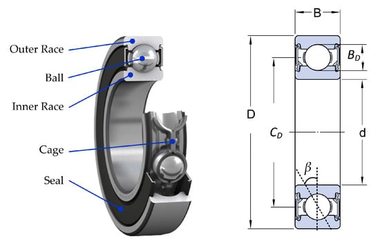 The rolling element bearings act as an electromechanical interface between the stator and the rotor of the motor. In addition, they represent the holding element from the shaft of the machine to ensure a proper rotation of the rotor. The bearings are constituted by two races, the inner race and the outer race, a number of rolling balls and the cage which provides equidistance between the balls as shown in Figure 1. Bearing faults can occur due to a number of factors. The most common factors are misalignments of the rotor, improper lubrication, excessive load and mechanical fatigue [15]. Failures may affect the bearing on both races and/or on the ball. Several studies have shown that the failure of each bearing element is manifested by a vibration frequency characterizing the fault type [23]. In particular, the following relationships apply: