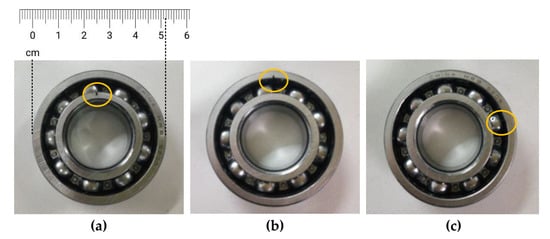 where is the number of bearing balls, and are the ball and the cage diameters respectively, is the contact angle and is the mechanical rotor frequency. For experimental purposes, in fault diagnosis studies, artificially generated faults are commonly used which are acquired by drilling or cutting the bearings. Such examples of the fault types can been seen in Figure 2.