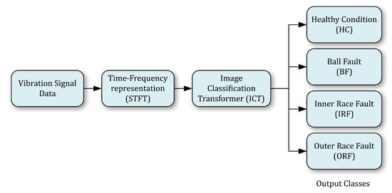 The proposed methodology mainly comprises three major tasks, i.e.,: (a) vibration raw data input; (b) transformation to time-frequency representation using short time Fourier transformation (STFT); (c) image classification of healthy status or faulty status using the image classification transformer (ICT). Figure 3 illustrates the overall proposed system which is described next.