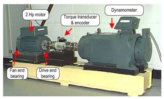 To evaluate the method, the publicly available seeded fault bearing dataset by Case Western Reserve University (CWRU) Bearing Data Center was used. The data were acquired by using a 2-horsepower (Hp) reliance electric motor with a torque transducer and a dynamometer for applying different loads, ranging from 0 to 3 Hp (Figure 4). Rotating speeds of the motor also varied from 1730 to 1797 rpm. Data for normal bearings were recorded using the deep groove ball bearing SKF6205-2RS JEM type at the drive end (with dimensions: inner race d = 25 mm, outer race D = 52 mm, width B = 15 mm). The drive end bearings were seeded with defects on the inner raceways, outer raceways and rolling elements with the assistance of an electro-discharge machine. The faulty bearings were reinstalled into the test-bed and vibration data were recorded for the same motor loads. The final overall dataset consists of ratings of healthy condition (HC), inner raceway fault (IRF), ball fault (BF) and outer raceway fault (ORF) signals under the considered operating conditions. Especially for the ORF, this has three variants: ORF at the center, ORF at the orthogonal and ORF at the opposite position. In this study, the variable length vibration acceleration signals were recorded at 12,000 samples/s (Hz) for the drive-end bearings.