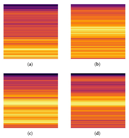 Example output vibration images obtained after applying STFT on raw vibration signals: (a) healthy condition (HC), (b) ball fault (BF), (c) inner race fault (IRF), (d) outer race fault (IRF).