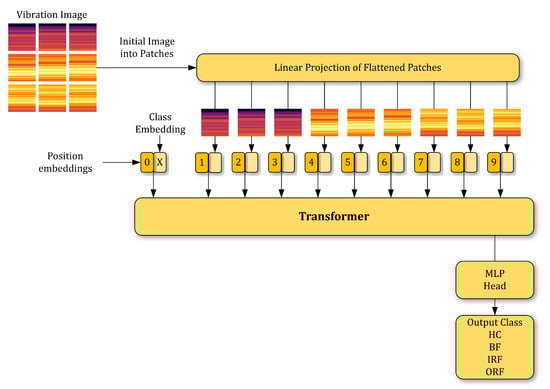 In order to classify the output vibration images after applying STFT, we are proposing here the image classification transformer (ICT). ICT is an adaptation of the initial architecture of the transformer designed for natural language processing (NLP) tasks, which was introduced recently by Vaswani et al. [26].