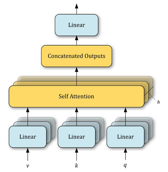 - Vaswani, A.; Shazeer, N.; Parmar, N.; Uszkoreit, J.; Jones, L.; Gomez, A.N.; Kaiser, L.; Polosukhin, I. Attention is All You Need. arXiv 2017, arXiv:cs.CL/1706.03762. [Google Scholar]
