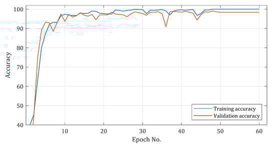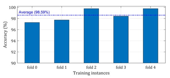 In order to decide which are the best fitting parameters for the ICT model, the training dataset was split randomly into 85% for the training and 15% for validation. We initiated multiple runs of the same training process and we observed that the best fitting parameters occur red between 25 and 50 epochs. The algorithm saved the parameters of each epoch and was able to determine in which epoch the best fitting existed, discarding all the others. As can been seen in Figure 10, at the 48th epoch, the training loss was the lowest, and the validation loss was minimum; and in the next epochs the training loss kept reducing, but the validation loss was slightly increasing. That means that the model reached the best fitting parameters at epoch 48, and after that was overfitting on the training data. The training accuracy surpassed 90% after the first five epochs and reached 100% at around 48. At the same time, the validation accuracy reached the highest accuracy at epoch 48, and then slightly decreased, as can been seen in Figure 11. Moreover, we trained the model with the Kfolds cross-validation approach with K set to five, and the validation accuracy of each fold along with the average validation accuracy can been seen in Figure 12. Thus, it can be said that, over the training period, the ICT model was able to learn the robust and generalized features of the STFT vibration images in order to diagnose the bearing faults and classify them into healthy or faulty classes accordingly.
