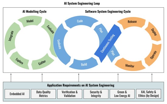 Artificial Intelligence (AI) System Engineering Lifecyle comprised of AI modelling cycle and software system development loop.