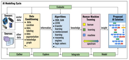 AI model lifecycle refers to the development steps of data-driven modelling, starting from data conditioning as basis for model training to finding a solution configuration of a proposed machine learning model for the task at hand. Typically these steps aim at extracting higher level semantics and meaning from lower level representations as indicated in Figure 2.