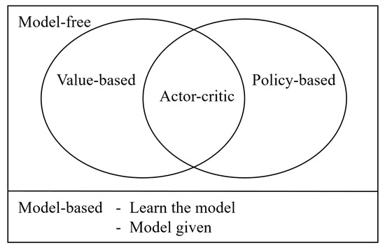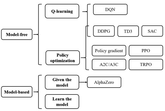 RL algorithms might be model-free or model-based, value-based and (or) policy-based, on-policy or off-policy, with sample backups or full backups, as shown in Figure 2 and Figure 3.