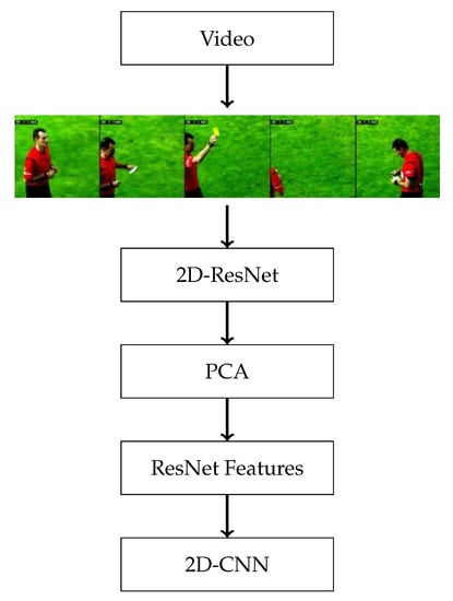 Illustration of the pipeline used by the video-based 2D-CNN model. A pre-trained ResNet is used to extract features from video, followed by PCA [1]. The features can then be used to train a network for action detection tasks.