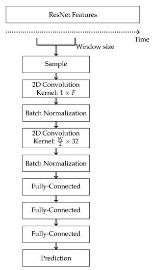 We use a 2D-CNN model that uses the pre-extracted ResNet features provided by SoccerNet. A visual representation of the overall pipeline is shown in Figure 3, and further details of the model are depicted in Figure 4. The model takes in features, where W is the window size used for sampling in seconds and . Inspired by the approach in SoccerNet [1], we first use a 2D convolution with a kernel . This is followed by batch-normalization and another 2D convolution that has a kernel of , such that it has a temporal receptive field of . Finally, we have two fully connected layers and an output layer.