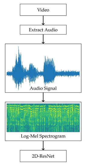 Illustration of the pipeline used by the audio-based model. First, audio is extracted from the video. The audio is used to compute Log-Mel spectrograms, which are then used as inputs to a 2D-ResNet.